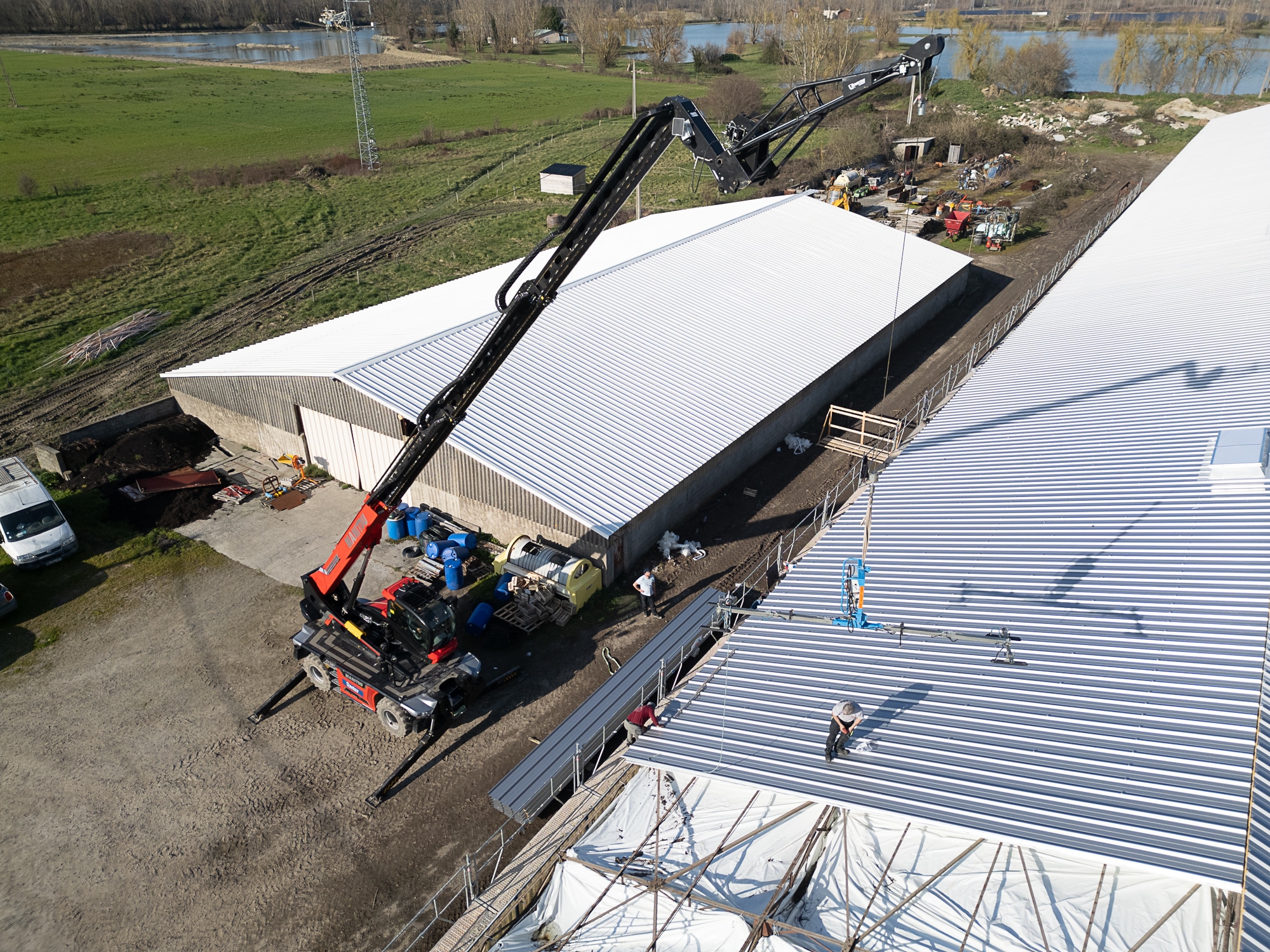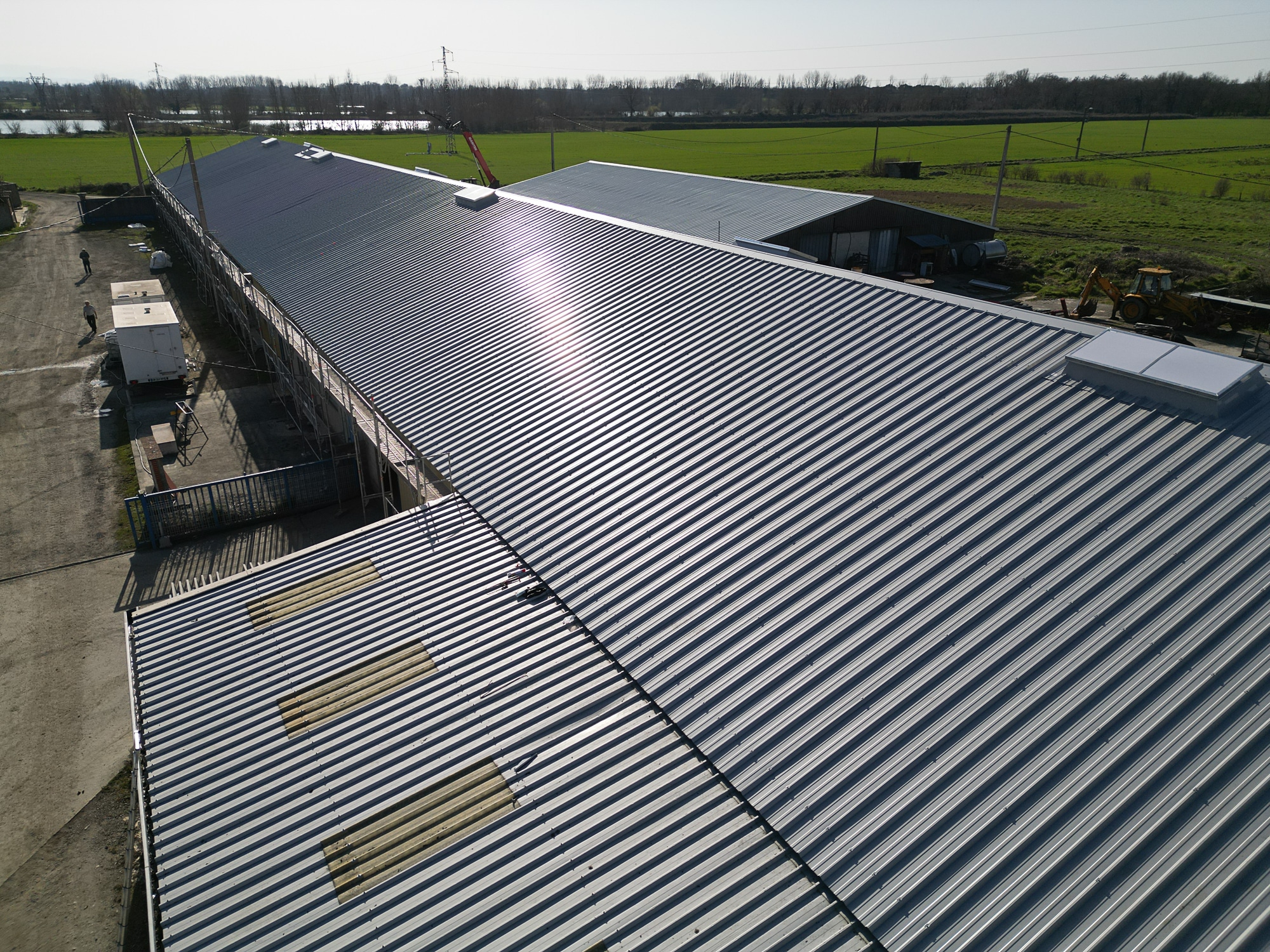 Le projet a débuté par la dépose des anciennes couvertures en fibres-ciment contenant de l’amiante. Pour moderniser l’enveloppe du bâtiment, nous avons installé : des panneaux sandwich Joris Ide : Une solution d’isolation haute performance avec mousse PIR de 40 mm.